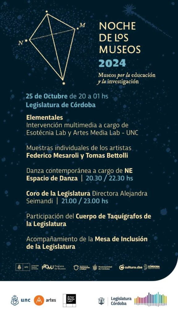 Bajo el lema “Museos por la educación y la investigación”, la Noche de los Museos en la Unicameral cordobesa ocupará la franja horaria de las 20 hasta la 1 de la madrugada, con entrada libre y gratuita.
